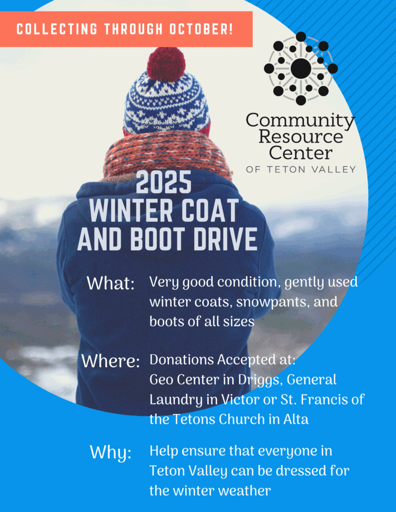 Drop off lightly used coats, pants, boots, and other winter items at Teton Geo Center in Driggs, General Laundry in Victor, the Tetonia City Building or the CRC office.